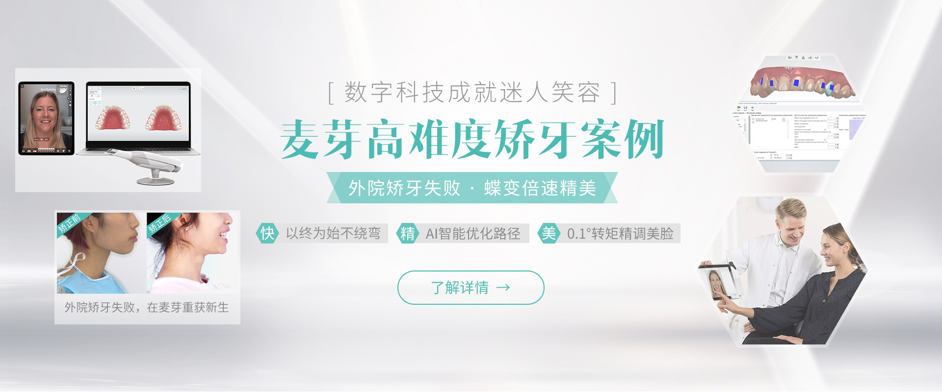 基于麦芽口腔独特的生物力学系统,以面形为基础的个性化美观弓形数据采集,通过AI智能软件设计牙根、弓形、咬合、笑线,优化多种转矩、咬合分离、早期牵引、序列弓丝、种植支抗等临床治疗方案,精确到每个细节,为您定制美丽的笑容曲线。