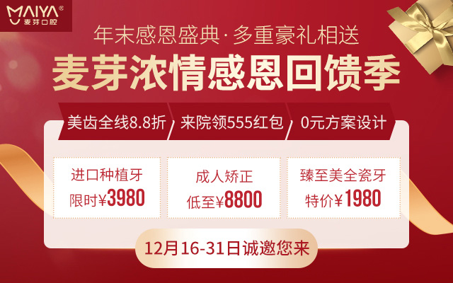 2020年已进入尾声,马上就要迎接新的一年,今年过年你还忍心看着父母食不知味、牙痛难忍,看着一桌美食却只能感叹吗?新的一年你还在害怕牙齿歪歪扭扭,聚会拍照时只会抿嘴笑吗?还在担心牙黄,影响颜值,让人觉得自己不卫生吗?12月26日,麦芽口腔将举办年末感恩回馈活动,周末48小时狂嗨不打烊! 来院即送价值1000元数字化种植方案设计,享进口种植体1980元,进口种植牙3980元,成人矫正8800元,牙齿美白698元,当天参与活动还将获得价值555元口福红包一份,还可参与免费抽进口种植体。现在致电8233 9968报名预约还可享博硕专家一对一亲诊及免费方案设计。机会难得,千万不要因为忽视和犹豫,而错失让父母重获口福、让自己重获自信笑容的良机。